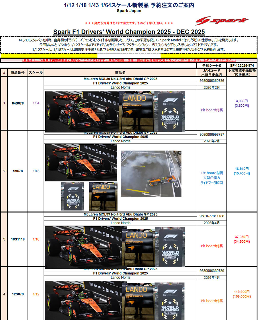 12分の1 レジン 12S078 McLaren MCL39 No.4 3rd Abu Dhabi GP 2025 F1 Drivers' World Champion 2025 Lando Norris 119900円