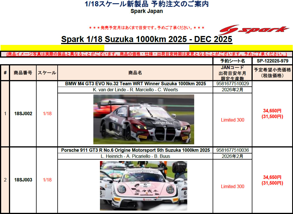 18分の1 レジン 18SJ002 BMW M4 GT3 EVO No.32 Team WRT Winner Suzuka 1000km 2025 K. van der Linde - R. Marciello - C. Weerts 34650円