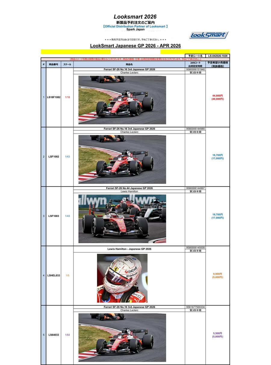 43分の1 レジン LSF1082 フェラーリ Ferrari SF-26 F1 日本 Japanese GP 2026 3rd C. ルクレール #16 18700円