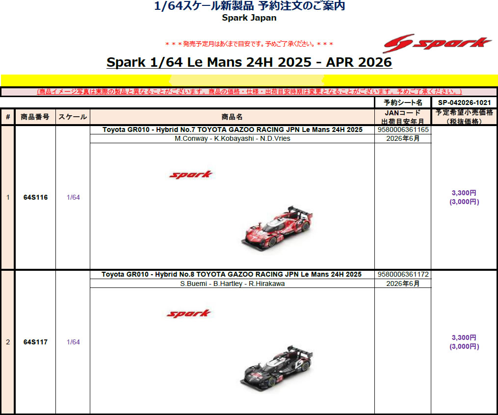 64分の1 ダイキャスト 64S116 Toyota GR010 - Hybrid No.7 TOYOTA GAZOO RACING JPN Le Mans 24H 2025 M.Conway - K.Kobayashi - N.D.Vries 3300円