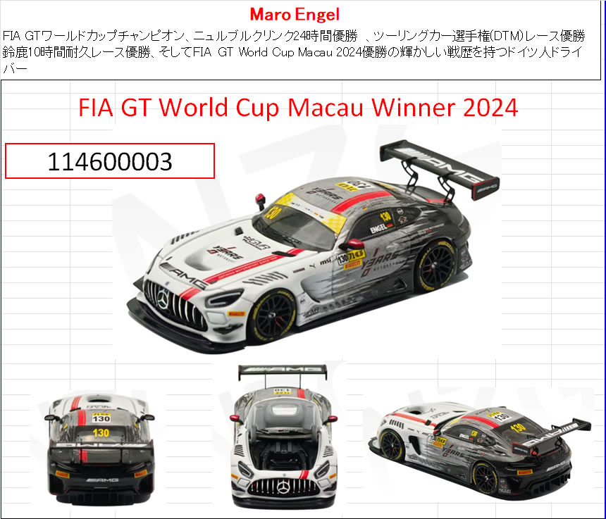 64分の1 ダイキャスト 114600003 メルセデスベンツ AMG GT3 2024年 FIA GT ワールドカップ マカオ優勝 #130 Maro Engel 7150円