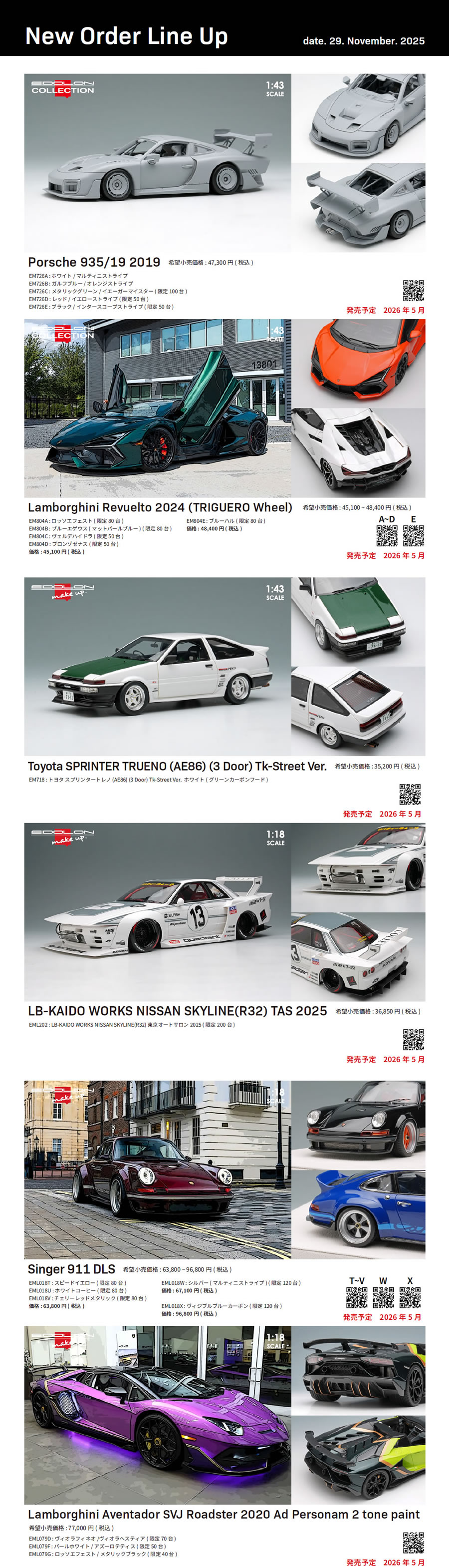 Lamborghini Revuelto 2024 (TRIGUERO Wheel) 45100円 EM804A : ロッソエフェスト ( 限定80 台) EM804B : ブルーエゲウス ( マットパールブルー) ( 限定80 台) EM804C : ヴェルデハイドラ ( 限定50 台) EM804D : ブロンゾゼナス ( 限定50 台)