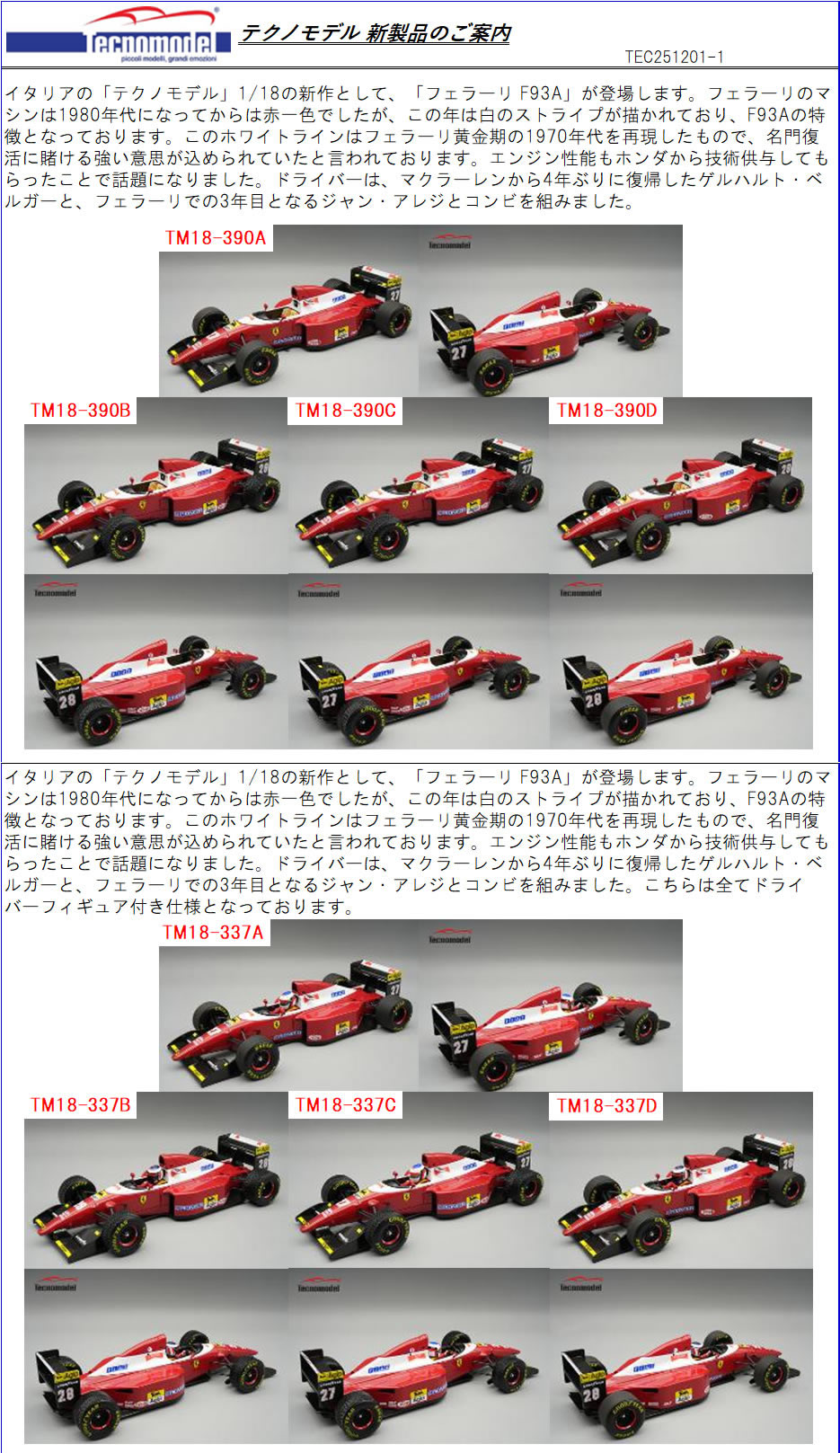 18分の1 レジン TM18-390A フェラーリ F93A モナコGP 1993 #27 Jean Alesi 63800円 TM18-390B フェラーリ F93A ヨーロッパGP 1993 28 Gerhard Berger レインタイヤ車 63800円 TM18-390C フェラーリ F93A ブラジルGP 1993 #27 Jean Alesiレインタイヤ車 63800円 TM18-390D フェラーリ F93A ドイツGP 1993 #28 Gerhard Berger 63800円 TMD18-337A フェラーリ F93A モナコGP 1993 #27 Jean Alesi ドライバーフィギュア付き 68200円 TMD18-337B フェラーリ F93A ヨーロッパGP 1993 #28 Gerhard Berger レインタイヤ車 ドライバーフィギュア付き 68200円 TMD18-337C フェラーリ F93A ブラジルGP 1993 #27 Jean Alesi レインタイヤ車 ドライバーフィギュア付き 68200円 TMD18-337D フェラーリ F93A ドイツGP 1993 #28 Gerhard Bergerドライバーフィギュア付き 68200円 予約は、7日(日)の午後5時まで 定価の10%OFFで受付中です。