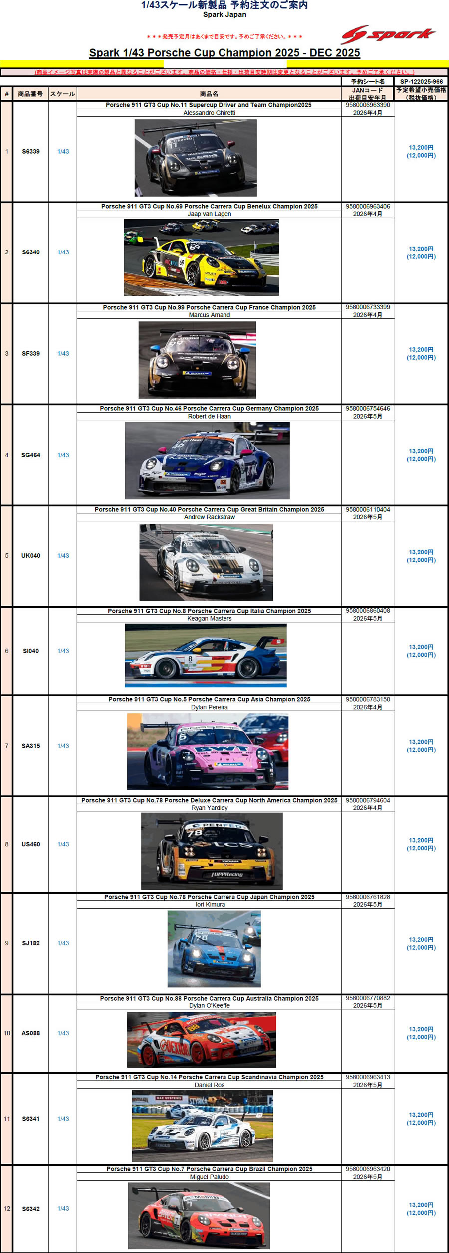 SJ182 Porsche 911 GT3 Cup No.78 Porsche Carrera Cup Japan Champion 2025 Iori Kimura 13200円