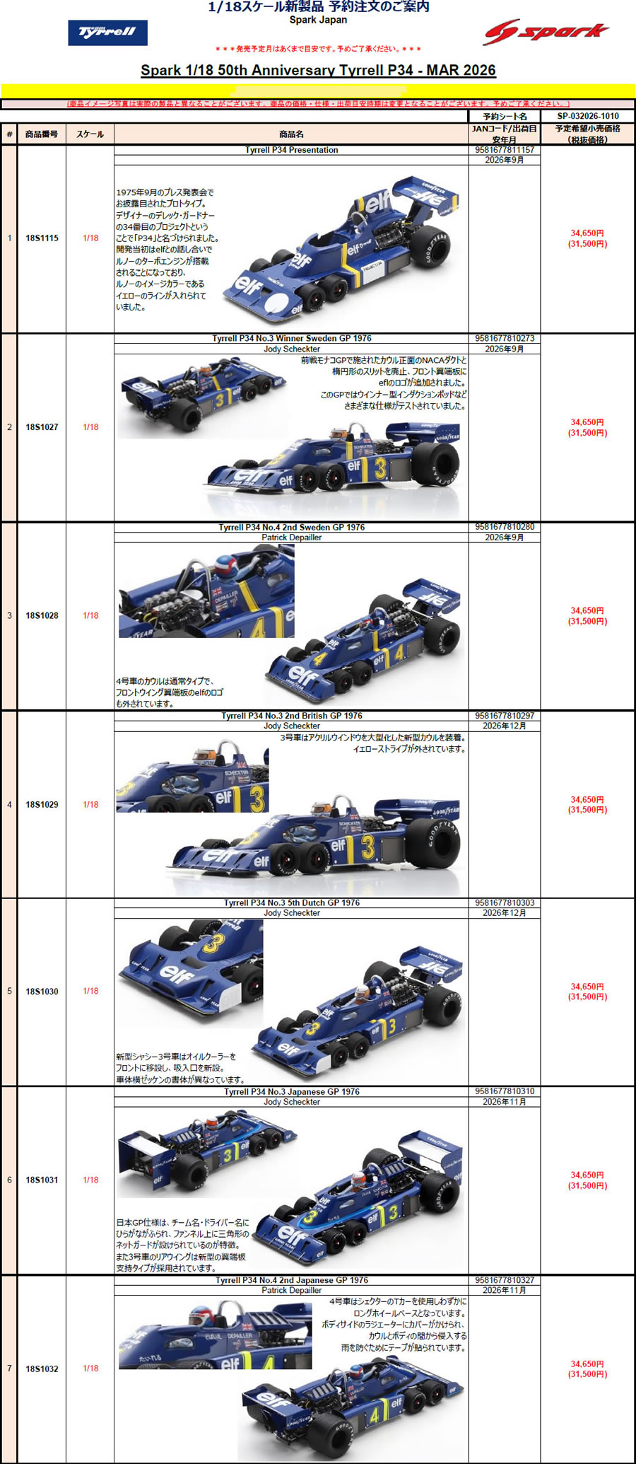 18S1031 Tyrrell P34 No.3 Japanese GP 1976 Jody Scheckter 34650円