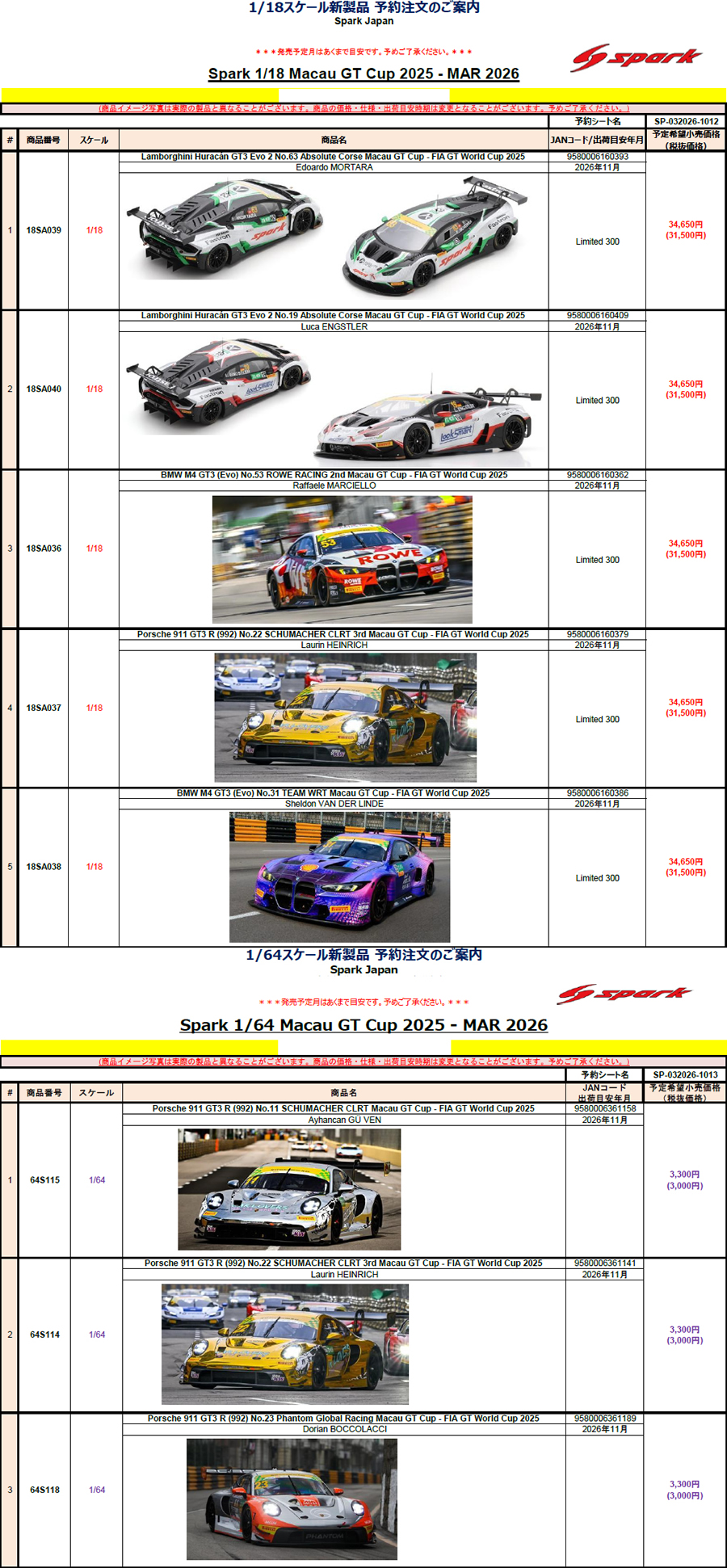 18分の1 レジン 18SA039 Lamborghini Huracan GT3 Evo 2 No.63 Absolute Corse Macau GT Cup - FIA GT World Cup 2025 Edoardo MORTARA 34650円