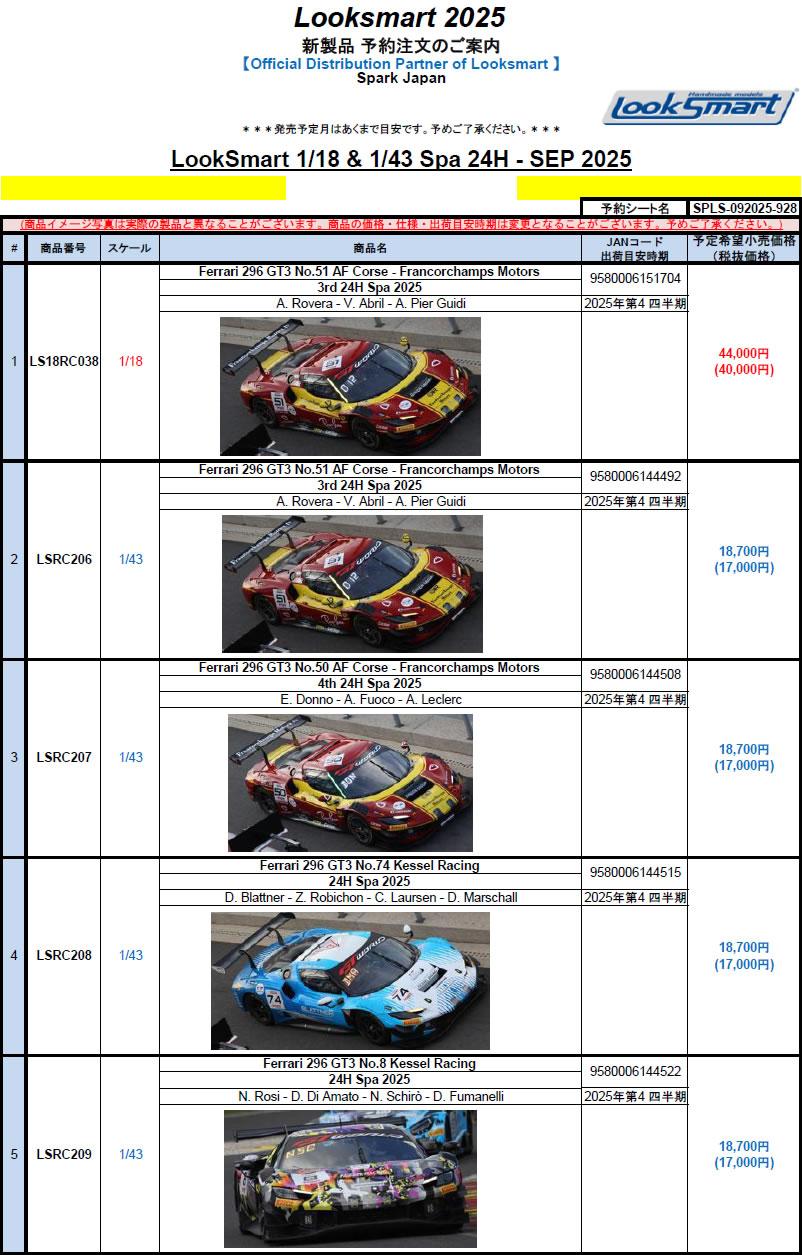 43分の1 レジン LSRC206 Ferrari 296 GT3 No.51 AF Corse - Francorchamps Motors 3rd 24H Spa 2025 A. Rovera - V. Abril - A. Pier Guidi 18700円