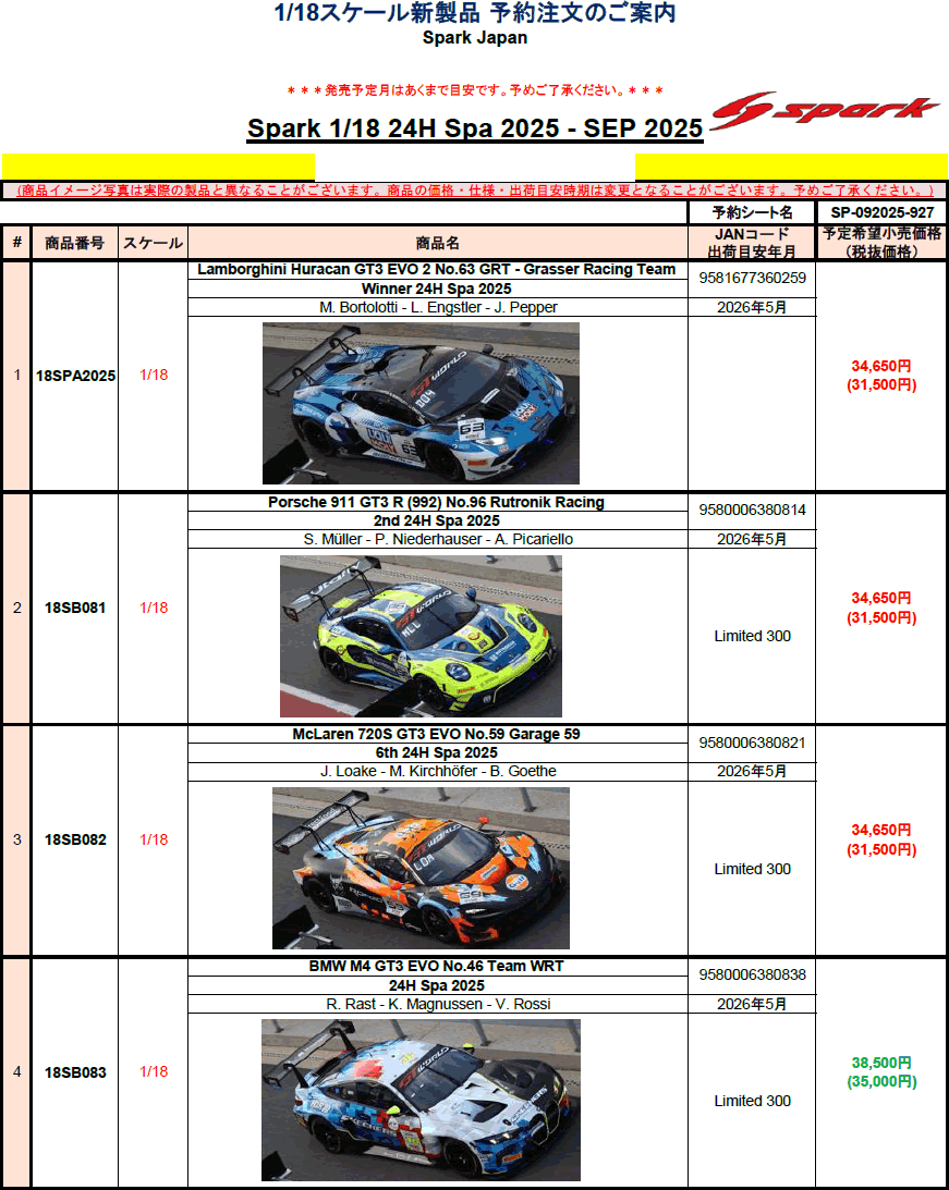 18分の1 レジン 18SPA2025 Lamborghini Huracan GT3 EVO 2 No.63 GRT - Grasser Racing Team Winner 24H Spa 2025 M. Bortolotti - L. Engstler - J. Pepper 34650円