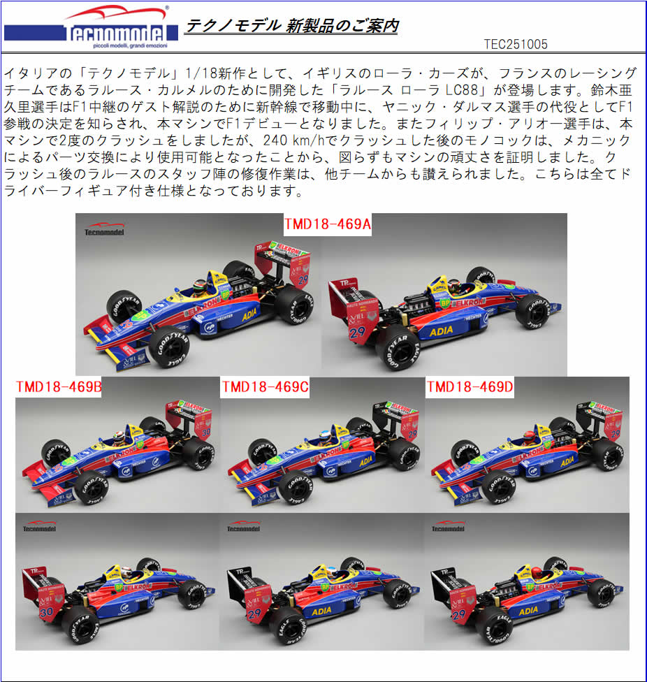 18分の1 レジン TMD18-469A ラルース ローラ LC88 #29 1988 日本GP 鈴木亜久里 ドライバーフィギュア付き 64900円 TMD18-469B ラルース ローラ LC88 #30 1988 モナコGP Philippe Alliot ドライバーフィギュア付き 64900円 TMD18-469C ラルース ローラ LC88 #29 1988 アメリカGP Yannick Dalmas ドライバーフィギュア付き 64900円 TMD18-469D ラルース ローラ LC88 #29 1988 オーストラリアGP Pierre-Henri Raphanel ドライバーフィギュア付き 64900円